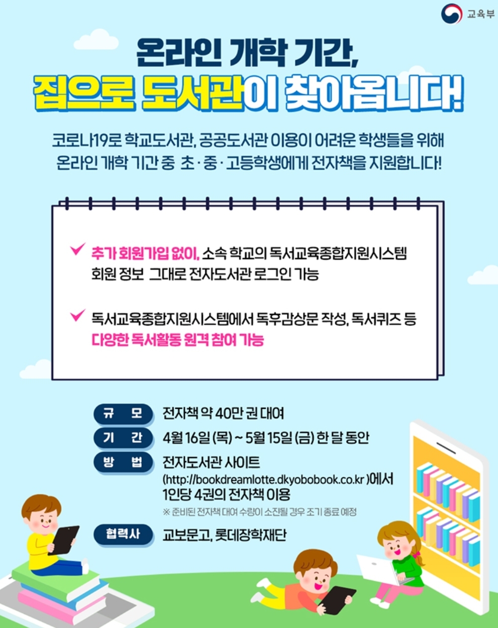 코로나19로 학교도서관, 공공도서관 이용이 어려운 학생들을 위해 온라인 개학 기간 중 초·중·고등학생에게 전자책을 지원합니다!