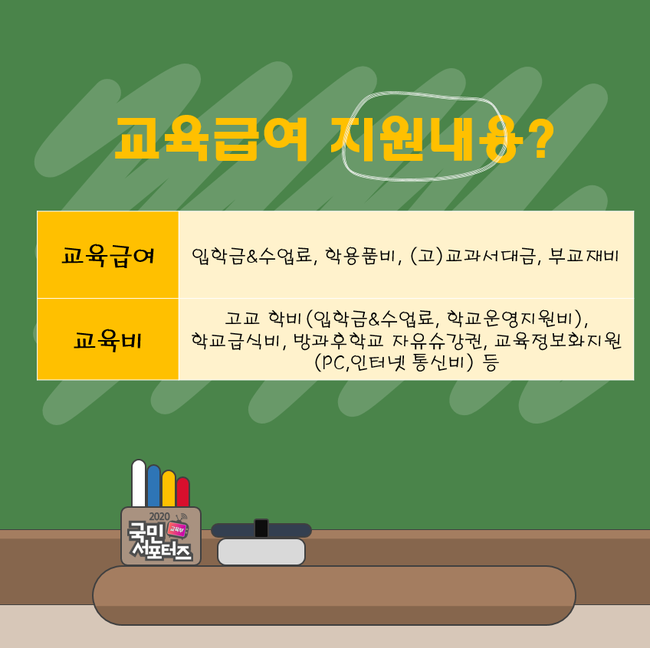 교육급여의 지원내용은 크게 부교재비, 학용품비, 교과서, 입학금 및 수업료로 나눌 수 있습니다. 교육급여의 경우, 초·중·고 학교급에 따라 지원금액이 달라집니다.