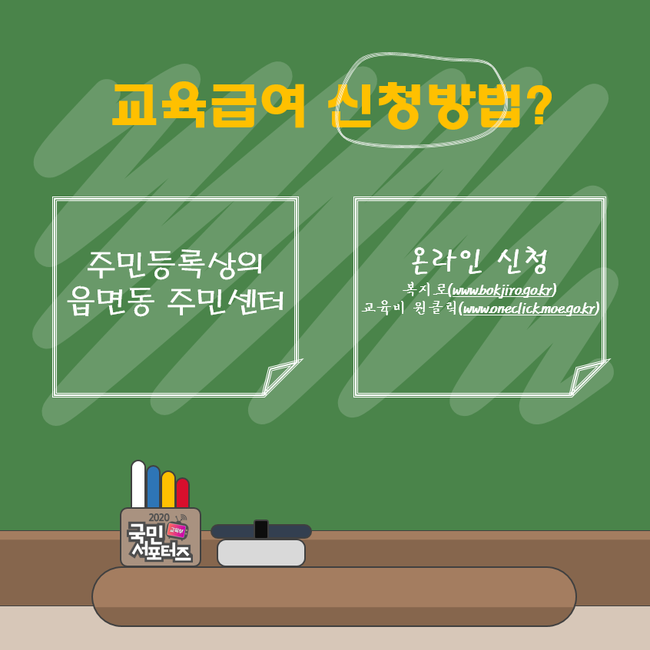 2020년 교육급여 집중 신청 기간은 3월 1일 ~ 3월 20일까지입니다. 하지만, 이것은 집중 신청 기간 일 뿐연중 상시 신청이 가능합니다.주민등록상의 읍면동 주민센터를 방문하거나, 온라인으로 신청하면 되는데요. 온라인 신청은 복지로(www.bokjiro.go.kr)나 교육비 원클릭(oneclick.moe.go.kr), 스마트폰의 ‘복지로’ 어플을 통해서 가능합니다.