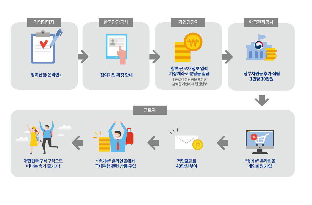 근로자분담금과 기업체분담금 합산금액(참여인원수 x 30만원)의 입금이 확인되면, 정부지원금(1인당 10만원)을 추가로 적립하여 “휴가샵” 온라인몰에서 참여근로자 1인당 40만원 포인트를 부여해드립니다.