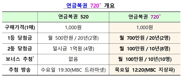 연금복권 720+는 기존 연금복권 520에 비해 장당 구매가격은 1000원으로 동일하지만 당첨금을 높였다.