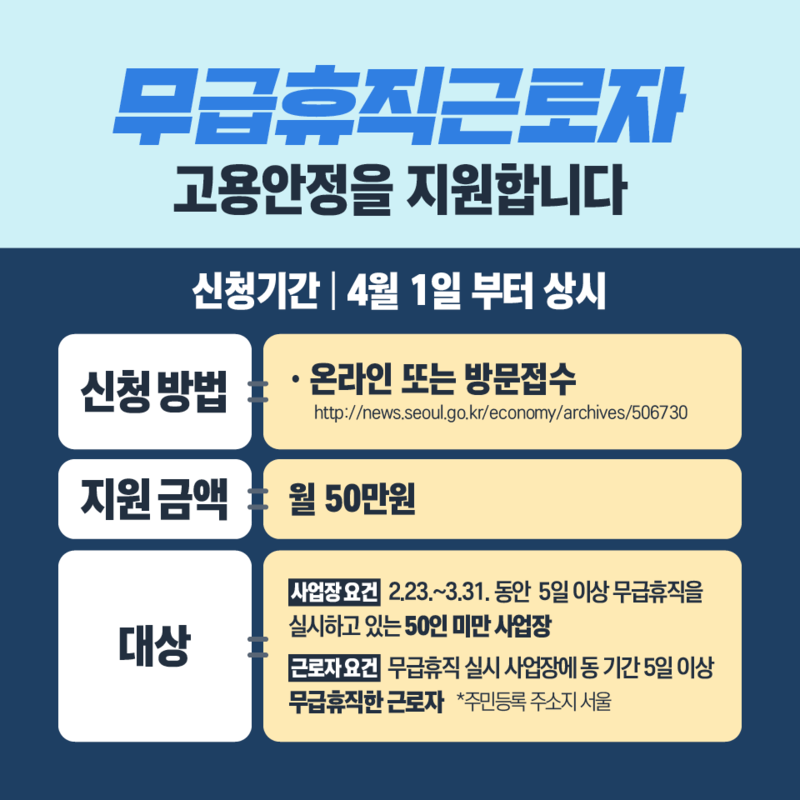 근로자 요건 : 무급휴직 실시 사업장에 동 기간 5일 이상 무급 휴직한 근로자 [주민등록 주소지 서울]