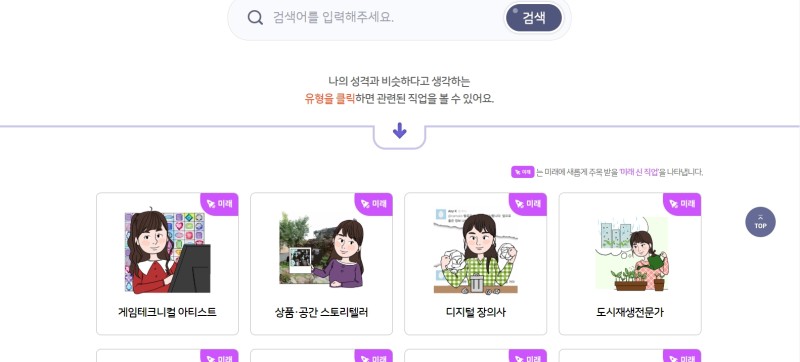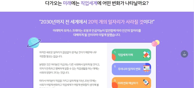 또, 미래 사회의 변화와 관련된 콘텐츠도 같이 제공하고 있는데요. 초등학생들에게 어려울 수 있는 미래 사회의 변화할 모습들을 학생들 눈높이에 맞춰서 제공하여 진로를 같이 고민하고 탐색해 볼 수 있도록 주니어 커리어넷은 동반자의 입장에서 도와주고 있습니다.