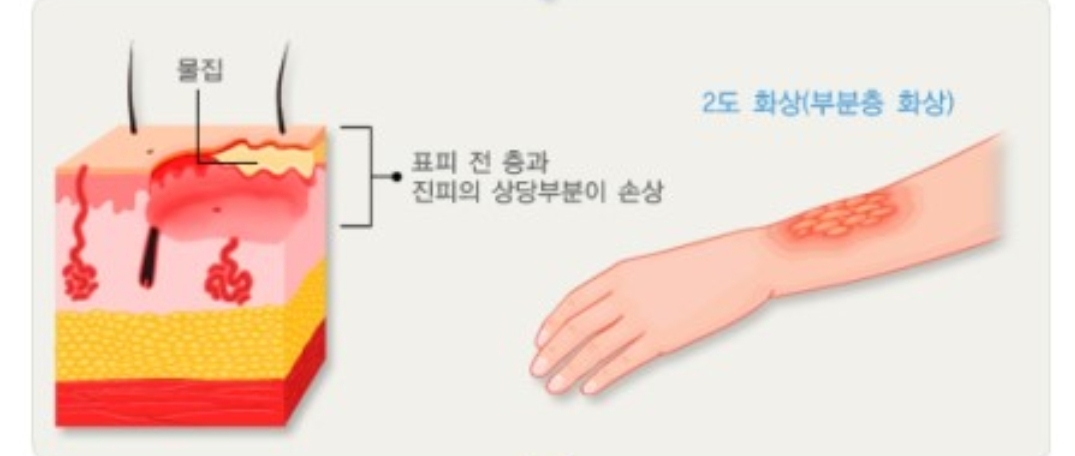 2도 화상은 1도 화상보다 더 깊은 조직 손상을 입는 것으로, 끓는 물이나 섬광, 화염, 기름 등에 의해 생기며 표피 전부와 진피의 일부를 포함하는 화상입니다. 2도 화상의 대부분은 물집이 생기고, 피하조직의 부종을 동반합니다. 물집을 제거하면 삼출액이 나오고 적색의 윤기 있는 진피가 나타납니다. 이 상처부위는 공기에 노출될 경우 깊어지고 감염의 위험성이 높아지기에, 물집을 그냥 두거나, 안의 액체만 제거하고 물집 껍데기는 그냥 덮어둔 채 병원에 바로 가야 합니다. 표재성 2도 화상의 경우 감염이 없을 때 10~14일 이내 치유가 됩니다. 심재성 2도 화상의 경우 통증을 느끼지 못하고, 압력만 느끼는 상태가 됩니다.