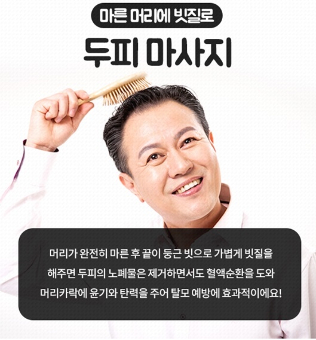 - 두피 마사지를 합니다.(아침, 저녁으로 손끝 또는 브러시를 이용해 두피를 부드럽게 마사지하면 모근의 혈액순환과 신진대사가 원활해져서 건강한 모발을 만들어 줍니다.)